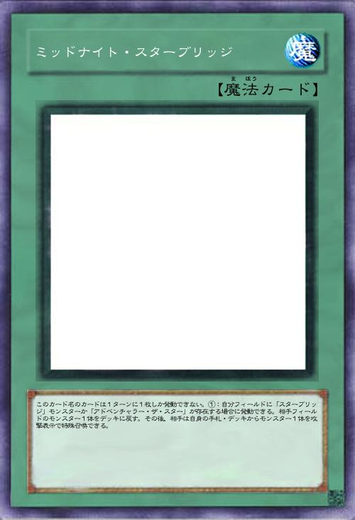 | このカード名のカードは1ターンに1枚しか発動できない。①:自分フィールドに「スターブリッジ」モンスターか「アドベンチャラー・ザ・スター」が存在する場合に発動できる。相手フィールドのモンスター1体をデッキに戻す。その後、相手は自身の手札・デッキからモンスター1体を攻撃表示で特殊召喚できる。 | |||
