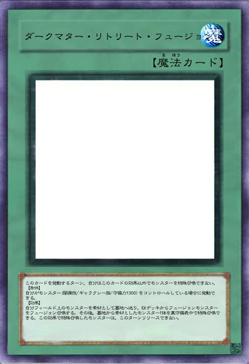 | このカードを発動するターン、自分はこのカードの効果以外でモンスターを特殊召喚できない。 【条件】 自分がモンスター(闇属性/ギャラクシー族/守備力1300)をコントロールしている場合に発動できる。 【効果】 自分フィールド上のモンスターを素材として墓地へ送り、EXデッキからフュージョンモンスターをフュージョン召喚する。その後、墓地から素材としたモンスター1体を裏守備表示で特殊召喚できる。この効果で特殊召喚したモンスターは、このターンリリースできない。 | |||