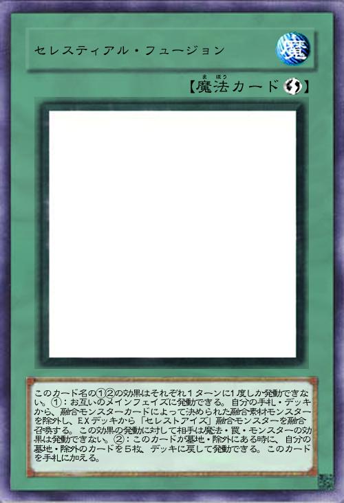 | このカード名の①②の効果はそれぞれ1ターンに1度しか発動できない。①:お互いのメインフェイズに発動できる。自分の手札・デッキから、融合モンスターカードによって決められた融合素材モンスターを除外し、EXデッキから「セレストアイズ」融合モンスターを融合召喚する。この効果の発動に対して相手は魔法・罠・モンスターの効果は発動できない。②:このカードが墓地・除外にある時に、自分の墓地・除外のカードを5枚、デッキに戻して発動できる。このカードを手札に加える。 | |||