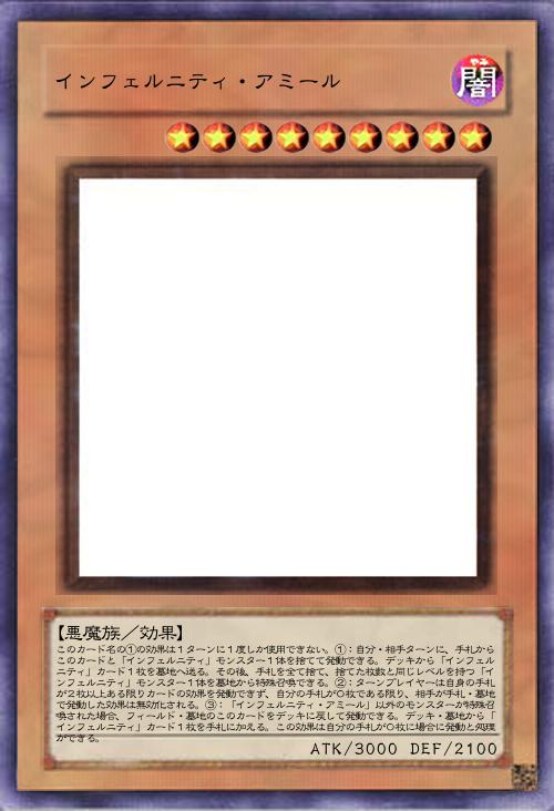 | このカード名の①の効果は1ターンに1度しか使用できない。①:自分・相手ターンに、手札からこのカードと「インフェルニティ」モンスター1体を捨てて発動できる。デッキから「インフェルニティ」カード1枚を墓地へ送る。その後、手札を全て捨て、捨てた枚数と同じレベルを持つ「インフェルニティ」モンスター1体を墓地から特殊召喚できる。②:ターンプレイヤーは自身の手札が2枚以上ある限りカードの効果を発動できず、自分の手札が0枚である限り、相手が手札・墓地で発動した効果は無効化される。③:「インフェルニティ・アミール」以外のモンスターが特殊召喚された場合、フィールド・墓地のこのカードをデッキに戻して発動できる。デッキ・墓地から「インフェルニティ」カード1枚を手札に加える。この効果は自分の手札が0枚に場合に発動と処理ができる。 | |||