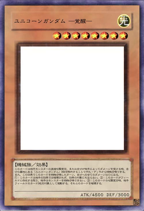 | このカードは相手モンスターの直接攻撃宣言、または自分が相手によってダメージを受ける時、自分の墓地にある「ユニコーンガンダム」3体を除外することで手札・デッキから特殊召喚できる。また、この効果でこのカードを特殊召喚したターン、自分への全てのダメージは0になる。 ①:このカードは相手の効果では破壊されず、効果の対象にもならない。②:このカードがフィールドに存在する限り、相手はモンスターを特殊召喚できない。③:このカードの攻撃宣言時、相手フィールドのカード3枚を対象として発動する。それらのカードを破壊する。 | |||