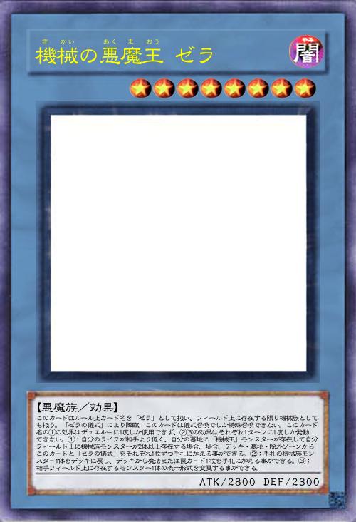 | このカードはルール上カード名を「ゼラ」として扱い、フィールド上に存在する限り機械族としても扱う。「ゼラの儀式」により降臨。このカードは儀式召喚でしか特殊召喚できない。このカード名の①の効果はデュエル中に1度しか使用できず、②③の効果はそれぞれ1ターンに1度しか発動できない。①:自分のライフが相手より低く、自分の墓地に「機械王」モンスターが存在して自分フィールド上に機械族モンスターが2体以上存在する場合、場合、デッキ・墓地・除外ゾーンからこのカードと「ゼラの儀式」をそれぞれ1枚ずつ手札に加える事ができる。②:手札の機械族モンスター1体をデッキに戻し、デッキから魔法または罠カード1枚を手札に加える事ができる。③:相手フィールド上に存在するモンスター1体の表示形式を変更する事ができる。 | |||