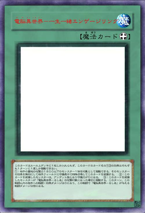| このカードはルール上デッキに1枚しか入れられず、このカードのカード名の①③の効果はそれぞれ1ターンに1度しか発動できない。 ①:相手の墓地の攻撃力1800以下のモンスター1体を対象として発動できる。そのモンスターの効果を無効にして相手フィールドに守備表示で特殊召喚してこのカードを装備する。 ②:このカードを装備したモンスターは、アンデット族となり守備力が0になる。 ③:このカードを装備したモンスターが「電脳異世界-るしあ」の攻撃対象になった場合に発動する。このターン、この戦闘以外の相手への戦闘・効果ダメージは0になり、この戦闘で「電脳異世界-るしあ」が与える戦闘ダメージは倍になる。 | |||