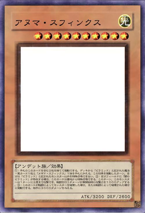 | ①:手札のこのカードを含む2枚を捨てて発動できる。デッキから「ピラミッド」と記された魔法・罠カード1枚と「メギド・スフィンクス」1体を手札に加える。この効果を発動したターン、自分は「ピラミッド」と記されたモンスター以外を特殊召喚できない。②:自分フィールドに「闇のピラミッド」が存在する場合、このカードは墓地から特殊召喚できる。このターン、このモンスターは1ターンに2度まで攻撃でき、戦闘を行うダメージ計算開始時に攻撃力を1000アップする。③:このカードが戦闘によってモンスターを破壊した場合、または戦闘によって破壊された場合に発動できる。相手に3000ダメージを与える。 | |||