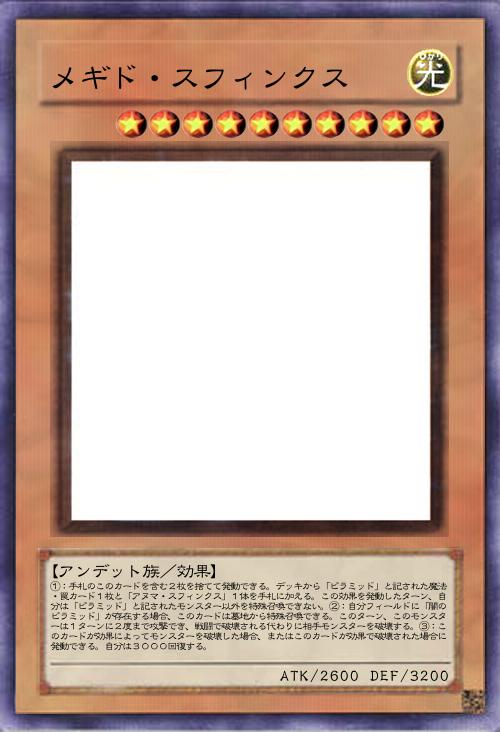 | ①:手札のこのカードを含む2枚を捨てて発動できる。デッキから「ピラミッド」と記された魔法・罠カード1枚と「アヌマ・スフィンクス」1体を手札に加える。この効果を発動したターン、自分は「ピラミッド」と記されたモンスター以外を特殊召喚できない。②:自分フィールドに「闇のピラミッド」が存在する場合、このカードは墓地から特殊召喚できる。このターン、このモンスターは1ターンに2度まで攻撃でき、戦闘で破壊される代わりに相手モンスターを破壊する。③:このカードが効果によってモンスターを破壊した場合、またはこのカードが効果で破壊された場合に発動できる。自分は3000回復する。 | |||