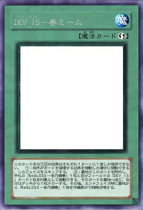 | このカード名の①②の効果はそれぞれ1ターンに1度しか使用できない。 ①:相手がカードを破壊する効果を発動した場合に発動できる。このフェイズをスキップする。 ②:墓地のこのカードを除外し、手札の「ReGLOSS-音乃瀬奏」1枚と自分フィールドの「DEV_IS」カード1枚を対象として発動できる。そのカードを墓地へ送り、自分はデッキから1枚ドローする。その後、エンドフェイズ時に墓地から「ReGLOSS-音乃瀬奏」1体を守備表示で特殊召喚する。 | |||