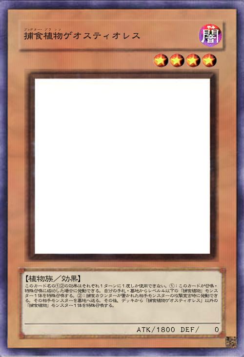 | このカード名の①②の効果はそれぞれ1ターンに1度しか使用できない。①:このカードが召喚・特殊召喚に成功した場合に発動できる。自分の手札・墓地からレベル4以下の「捕食植物」モンスター1体を特殊召喚する。②:捕食カウンターが置かれた相手モンスターの攻撃宣言時に発動できる。その相手モンスターを墓地へ送る。その後、デッキから「捕食植物ゲオスティオレス」以外の「捕食植物」モンスター1体を特殊召喚する。 | |||