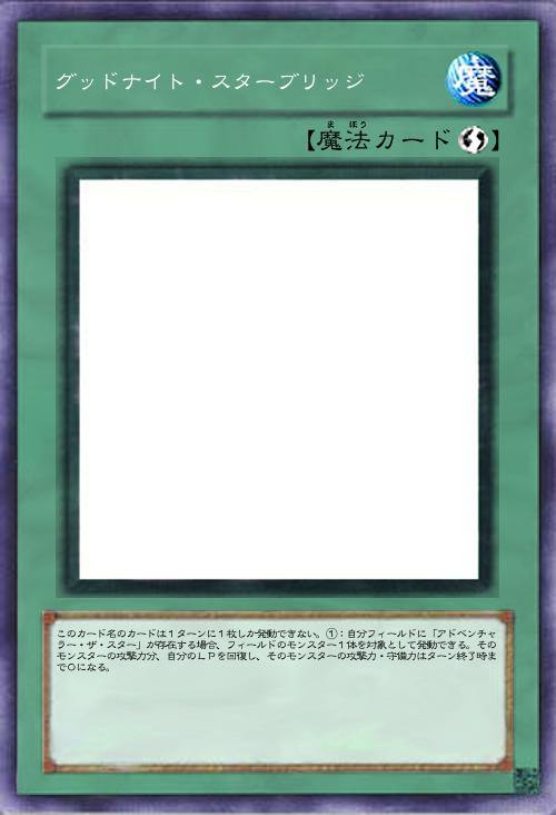 | このカード名のカードは1ターンに1枚しか発動できない。①:自分フィールドに「アドベンチャラー・ザ・スター」が存在する場合、フィールドのモンスター1体を対象として発動できる。そのモンスターの攻撃力分、自分のLPを回復し、そのモンスターの攻撃力・守備力はターン終了時まで0になる。 | |||