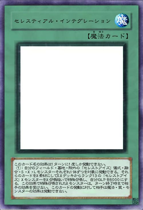 | このカード名の効果は1ターンに1度しか発動できない。 ①:自分のフィールド・墓地・除外の「セレストアイズ」儀式・融合・S・X・Lモンスターそれぞれ1体ずつを対象に発動できる。それらのカードをX素材にしてEXデッキからランク13の「セレストアイズ」XモンスターをX召喚扱いで特殊召喚し、自分のLPを8000にする。この効果で特殊召喚されたXモンスターは、ターン終了時まで相手の効果を受けない。このカードの発動に対して相手は魔法・罠・モンスターの効果は発動できない。 | |||