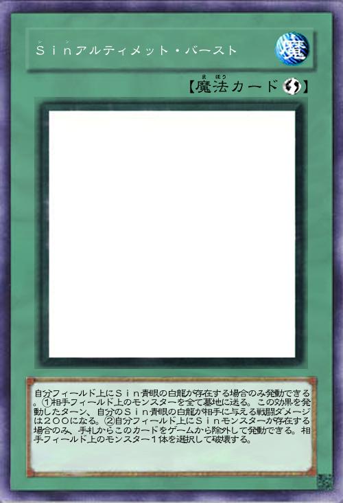 | 自分フィールド上にSin青眼の白龍が存在する場合のみ発動できる。①相手フィールド上のモンスターを全て墓地に送る。この効果を発動したターン、自分のSin青眼の白龍が相手に与える戦闘ダメージは200になる。②自分フィールド上にSinモンスターが存在する場合のみ、手札からこのカードをゲームから除外して発動できる。相手フィールド上のモンスター1体を選択して破壊する。 | |||