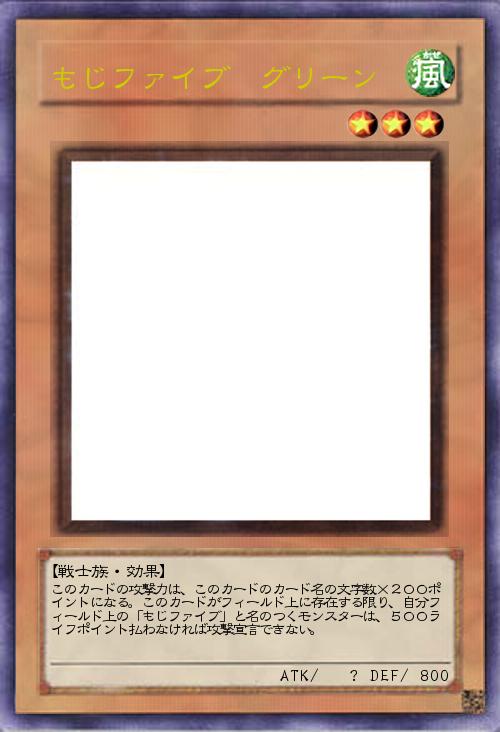 | このカードの攻撃力は、このカードのカード名の文字数×200ポイントになる。このカードがフィールド上に存在する限り、自分フィールド上の「もじファイブ」と名のつくモンスターは、500ライフポイント払わなければ攻撃宣言できない。 | |||