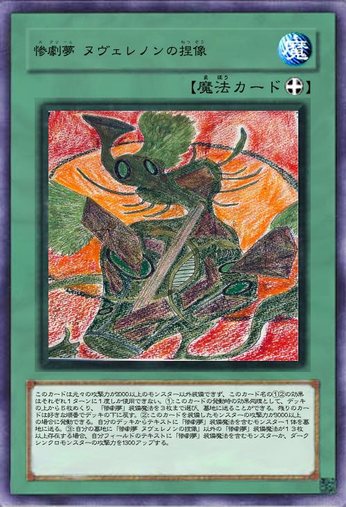| このカードは元々の攻撃力が2000以上のモンスター以外装備できず、このカード名の①②の効果はそれぞれ1ターンに1度しか使用できない。①:このカードの発動時の効果処理として、デッキの上から5枚めくり、「惨劇夢」装備魔法を3枚まで選び、墓地に送ることができる。残りのカードは好きな順番でデッキの下に戻す。②:このカードを装備したモンスターの攻撃力が3000以上の場合に発動できる。自分のデッキからテキストに「惨劇夢」装備魔法を含むモンスター1体を墓地に送る。③:自分の墓地に「惨劇夢 ヌヴェレノンの捏像」以外の「惨劇夢」装備魔法が13枚以上存在する場合、自分フィールドのテキストに「惨劇夢」装備魔法を含むモンスターか、ダークシンクロモンスターの攻撃力を1300アップする。 | |||