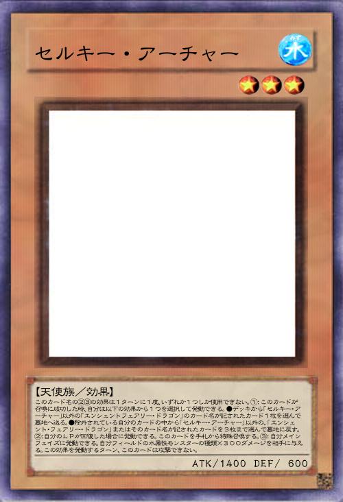 | このカード名の②③の効果は1ターンに1度、いずれか1つしか使用できない。①:このカードが召喚に成功した時、自分は以下の効果から1つを選択して発動できる。●デッキから「セルキー・アーチャー」以外の「エンシェントフェアリー・ドラゴン」のカード名が記されたカード1枚を選んで墓地へ送る。●除外されている自分のカードの中から「セルキー・アーチャー」以外の、「エンシェント・フェアリー・ドラゴン」またはそのカード名が記されたカードを3枚まで選んで墓地に戻す。②:自分のLPが回復した場合に発動できる。このカードを手札から特殊召喚する。③:自分メインフェイズに発動できる。自分フィールドの水属性モンスターの種類×300ダメージを相手に与える。この効果を発動するターン、このカードは攻撃できない。 | |||