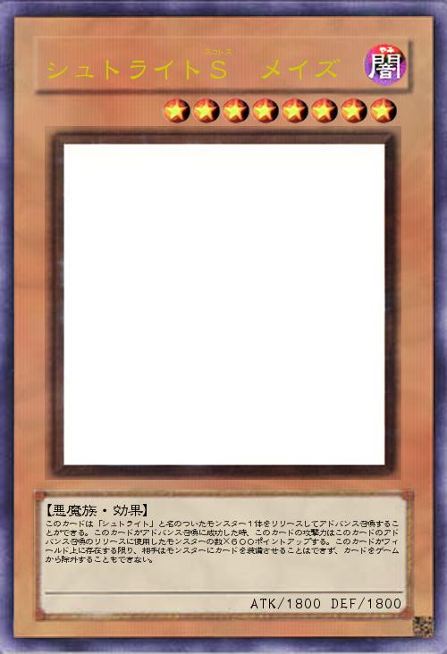 | このカードは「シュトライト」と名のついたモンスター1体をリリースしてアドバンス召喚することができる。このカードがアドバンス召喚に成功した時、このカードの攻撃力はこのカードのアドバンス召喚のリリースに使用したモンスターの数×600ポイントアップする。このカードがフィールド上に存在する限り、相手はモンスターにカードを装備させることはできず、カードをゲームから除外することもできない。 | |||
