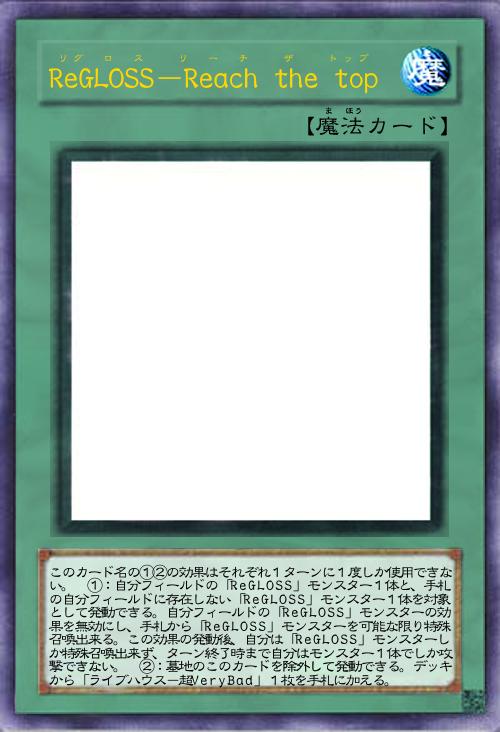 | このカード名の①②の効果はそれぞれ1ターンに1度しか使用できない。 ①:自分フィールドの「ReGLOSS」モンスター1体と、手札の自分フィールドに存在しない「ReGLOSS」モンスター1体を対象として発動できる。自分フィールドの「ReGLOSS」モンスターの効果を無効にし、手札から「ReGLOSS」モンスターを可能な限り特殊召喚出来る。この効果の発動後、自分は「ReGLOSS」モンスターしか特殊召喚出来ず、ターン終了時まで自分はモンスター1体でしか攻撃できない。 ②:墓地のこのカードを除外して発動できる。デッキから「ライブハウス-超VeryBad」1枚を手札に加える。 | |||