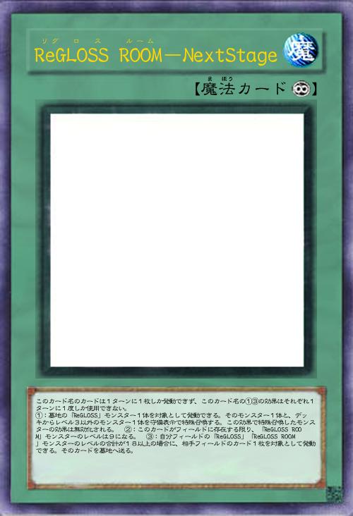 | このカード名のカードは1ターンに1枚しか発動できず、このカード名の①③の効果はそれぞれ1ターンに1度しか使用できない。 ①:墓地の「ReGLOSS」モンスター1体を対象として発動できる。そのモンスター1体と、デッキからレベル3以外のモンスター1体を守備表示で特殊召喚する。この効果で特殊召喚したモンスターの効果は無効化される。 ②:このカードがフィールドに存在する限り、「ReGLOSS ROOM」モンスターのレベルは9になる。 ③:自分フィールドの「ReGLOSS」「ReGLOSS ROOM」モンスターのレベルの合計が18以上の場合に、相手フィールドのカード1枚を対象として発動できる。そのカードを墓地へ送る。 | |||