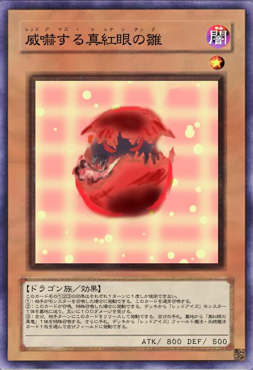 | このカード名の①②③の効果はそれぞれ1ターンに1度しか使用できない。 ①:相手がモンスターを召喚した場合に発動できる。このカードを通常召喚する。 ②:このカードが召喚、特殊召喚した場合に発動できる。デッキから「レッドアイズ」モンスター1体を墓地に送り、互いに100ダメージを受ける。 ③:自分、相手ターンにこのカードをリリースして発動できる。自分の手札、墓地から「真紅眼の黒竜」1体を特殊召喚する。さらに手札、デッキから「レッドアイズ」フィールド魔法・永続魔法カード1枚を選んで自分フィールドに発動できる。 | |||