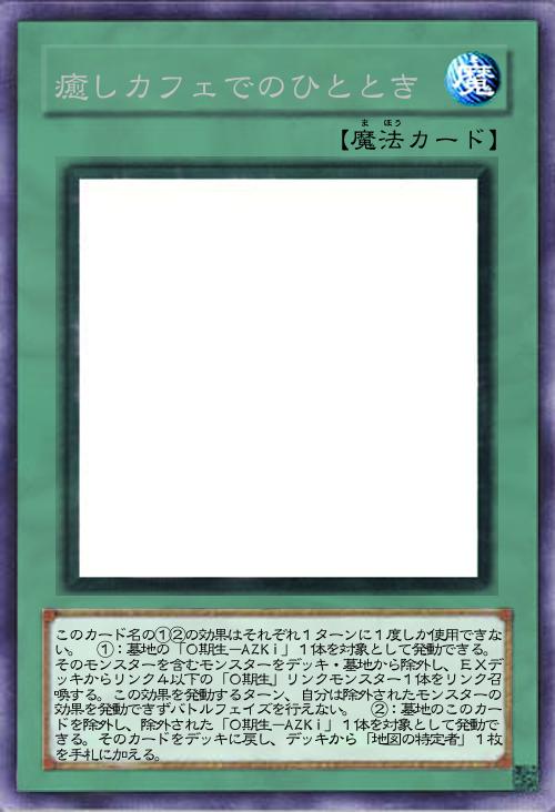 | このカード名の①②の効果はそれぞれ1ターンに1度しか使用できない。 ①:墓地の「0期生-AZKi」1体を対象として発動できる。そのモンスターを含むモンスターをデッキ・墓地から除外し、EXデッキからリンク4以下の「0期生」リンクモンスター1体をリンク召喚する。この効果を発動するターン、自分は除外されたモンスターの効果を発動できずバトルフェイズを行えない。 ②:墓地のこのカードを除外し、除外された「0期生-AZKi」1体を対象として発動できる。そのカードをデッキに戻し、デッキから「地図の特定者」1枚を手札に加える。 | |||