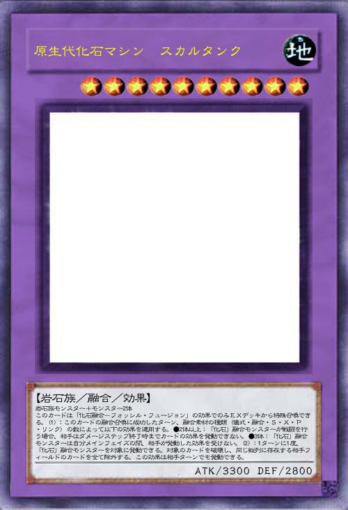 | 岩石族モンスター+モンスター2体 このカードは「化石融合-フォッシル・フュージョン」の効果でのみEXデッキから特殊召喚できる。(1):このカードの融合召喚に成功したターン、融合素材の種類(儀式・融合・S・X・P・リンク)の数によって以下の効果を適用する。●2体以上:「化石」融合モンスターが戦闘を行う場合、相手はダメージステップ終了時までカードの効果を発動できない。●3体:「化石」融合モンスターは自分メインフェイズの間、相手が発動した効果を受けない。(2):1ターンに1度、「化石」融合モンスターを対象に発動できる。対象のカードを破壊し、同じ縦列に存在する相手フィールドのカードを全て除外する。この効果は相手ターンでも発動できる。 | |||