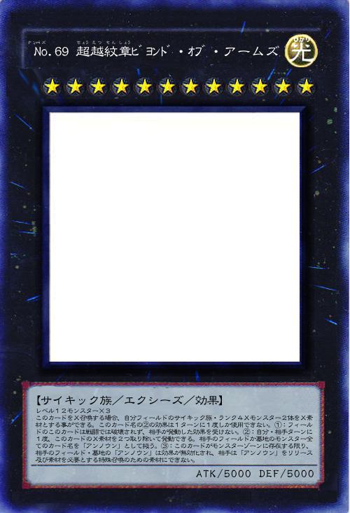 | レベル12モンスター×3 このカードをX召喚する場合、自分フィールドのサイキック族・ランク4Xモンスター2体をX素材とする事ができる。このカード名の②の効果は1ターンに1度しか使用できない。①:フィールドのこのカードは戦闘では破壊されず、相手が発動した効果を受けない。②:自分・相手ターンに1度、このカードのX素材を2つ取り除いて発動できる。相手のフィールドか墓地のモンスター全てのカード名を「アンノウン」として扱う。③:このカードがモンスターゾーンに存在する限り、相手のフィールド・墓地の「アンノウン」は効果が無効化され、相手は「アンノウン」をリリース及び素材を必要とする特殊召喚のための素材にできない。 | |||