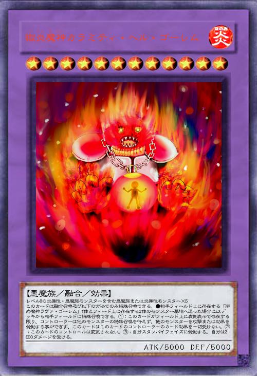 | レベル8の炎属性・悪魔族モンスターを含む悪魔族または炎属性モンスター×5 このカードは融合召喚及び以下の方法でのみ特殊召喚できる。●相手フィールド上に存在する「溶岩魔神ラヴァ・ゴーレム」1体とフィード上に存在する2体のモンスター墓地へ送った場合にEXデッキから相手フィールドに特殊召喚できる。①:このカードがフィールド上に表側表示で存在する限り、コントローラーは他のモンスターの特殊召喚を行えず、他のモンスターを攻撃または効果を発動する事ができず、このカードはこのカードのコントローラーのカード効果を一切受けない。②:このカードのコントロールは変更されない。③:自分スタンバイフェイズに発動する。自分は2000ダメージを受ける。 | |||