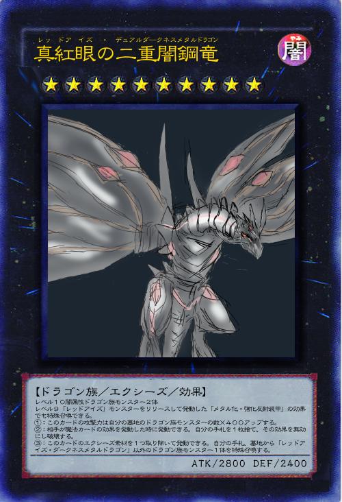 | レベル10闇属性ドラゴン族モンスター2体 レベル9「レッドアイズ」モンスターをリリースして発動した「メタル化・強化反射装甲」の効果でも特殊召喚できる。 ①:このカードの攻撃力は自分の墓地のドラゴン族モンスターの数×400アップする。 ②:相手が魔法カードの効果を発動した時に発動できる。自分の手札を1枚捨て、その効果を無効にし破壊する。 ③:このカードのエクシーズ素材を1つ取り除いて発動できる。自分の手札、墓地から「レッドアイズ・ダークネスメタルドラゴン」以外のドラゴン族モンスター1体を特殊召喚する。 | |||