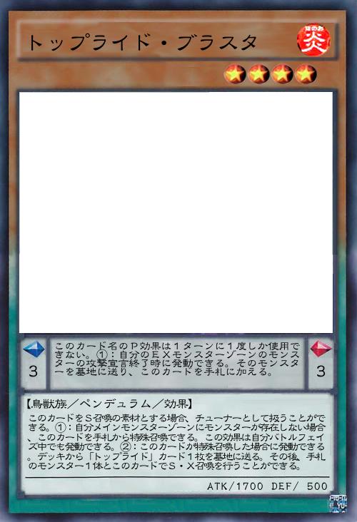 | このカードをS召喚の素材とする場合、チューナーとして扱うことができる。①:自分メインモンスターゾーンにモンスターが存在しない場合、このカードを手札から特殊召喚できる。この効果は自分バトルフェイズ中でも発動できる。②:このカードが特殊召喚した場合に発動できる。デッキから「トップライド」カード1枚を墓地に送る。その後、手札のモンスター1体とこのカードでS・X召喚を行うことができる。 | |||