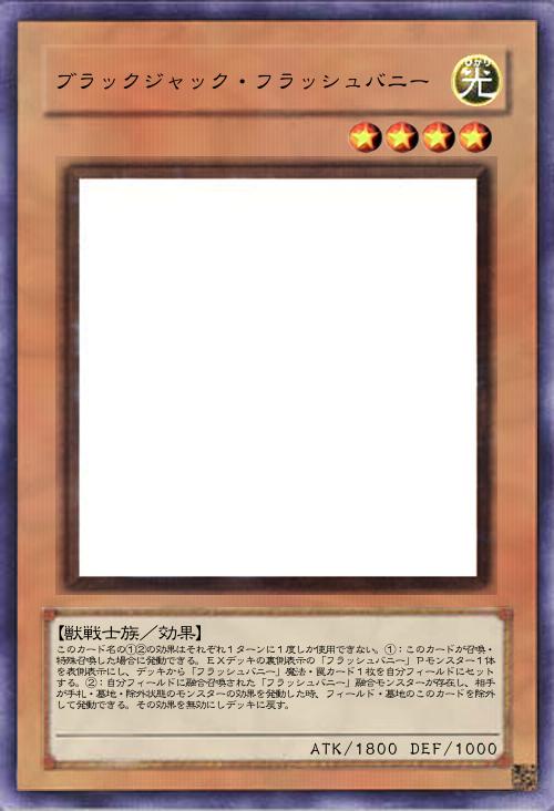 | このカード名の①②の効果はそれぞれ1ターンに1度しか使用できない。①:このカードが召喚・特殊召喚した場合に発動できる。EXデッキの裏側表示の「フラッシュバニー」Pモンスター1体を表側表示にし、デッキから「フラッシュバニー」魔法・罠カード1枚を自分フィールドにセットする。②:自分フィールドに融合召喚された「フラッシュバニー」融合モンスターが存在し、相手が手札・墓地・除外状態のモンスターの効果を発動した時、フィールド・墓地のこのカードを除外して発動できる。その効果を無効にしデッキに戻す。 | |||