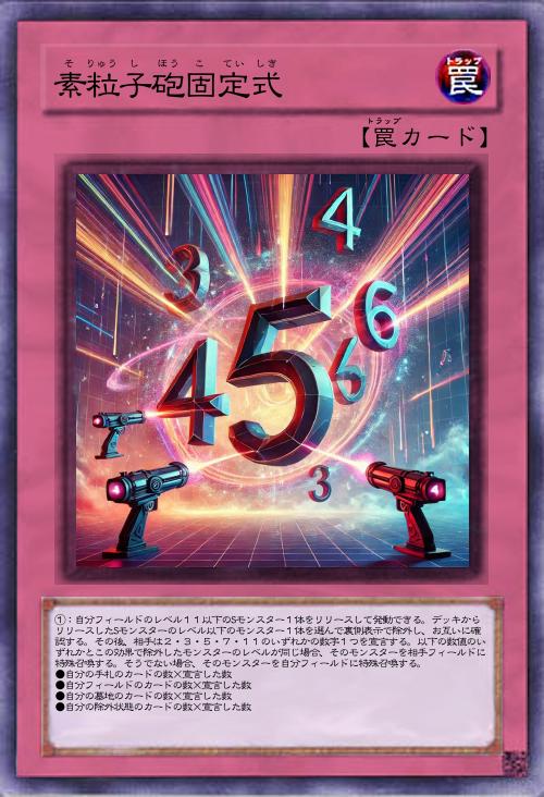 | ①:自分フィールドのレベル11以下のSモンスター1体をリリースして発動できる。デッキからリリースしたSモンスターのレベル以下のモンスター1体を選んで裏側表示で除外し、お互いに確認する。その後、相手は2・3・5・7・11のいずれかの数字1つを宣言する。以下の数値のいずれかとこの効果で除外したモンスターのレベルが同じ場合、そのモンスターを相手フィールドに特殊召喚する。そうでない場合、そのモンスターを自分フィールドに特殊召喚する。 ●自分の手札のカードの数×宣言した数 ●自分フィールドのカードの数×宣言した数 ●自分の墓地のカードの数×宣言した数 ●自分の除外状態のカードの数×宣言した数 | |||