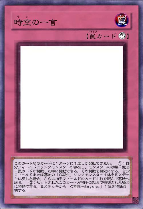 | このカード名のカードは1ターンに1度しか発動できない。 ①:自分フィールドにリンクモンスターが存在し、モンスターの効果・魔法・罠カードが発動した時に発動できる。その発動を無効にする。自分フィールドまたは墓地の「0期生」リンクモンスター1体をEXデッキに戻した場合、さらに相手フィールドのカード1枚を選んで墓地へ送る。 ②:セットされたこのカードが相手の効果で破壊された場合に発動できる。EXデッキから「0期生-Beyond」1体を特殊召喚する。 | |||