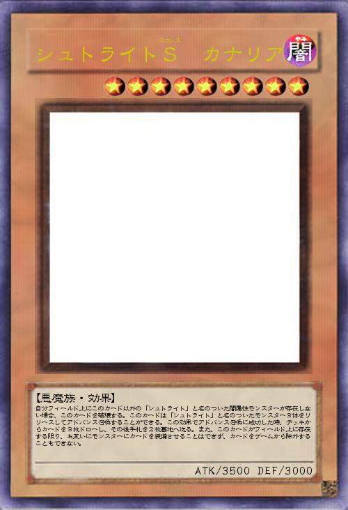 | 自分フィールド上にこのカード以外の「シュトライト」と名のついた闇属性モンスターが存在しない場合、このカードを破壊する。このカードは「シュトライト」と名のついたモンスター3体をリリースしてアドバンス召喚することができる。この効果でアドバンス召喚に成功した時、デッキからカードを3枚ドローし、その後手札を2枚墓地へ送る。また、このカードがフィールド上に存在する限り、お互いにモンスターにカードを装備させることはできず、カードをゲームから除外することもできない。 | |||