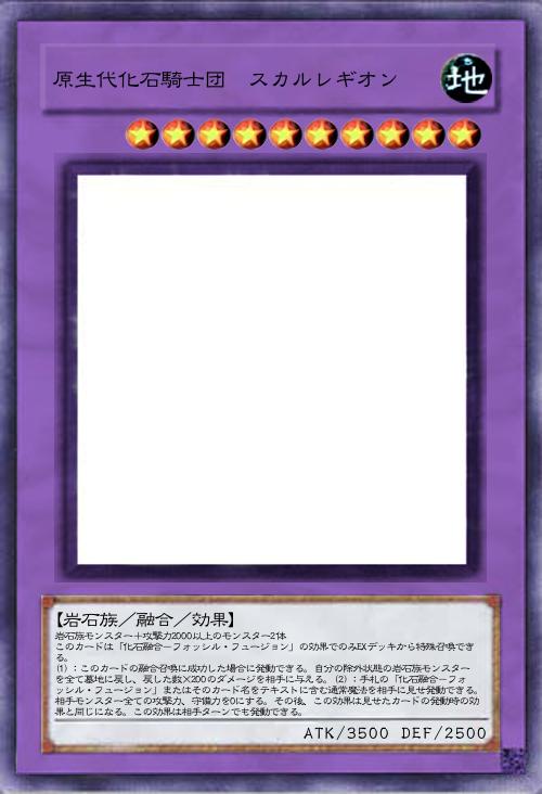 | 岩石族モンスター+攻撃力2000以上のモンスター2体 このカードは「化石融合-フォッシル・フュージョン」の効果でのみEXデッキから特殊召喚できる。 (1):このカードの融合召喚に成功した場合に発動できる。自分の除外状態の岩石族モンスターを全て墓地に戻し、戻した数×200のダメージを相手に与える。(2):手札の「化石融合-フォッシル・フュージョン」またはそのカード名をテキストに含む通常魔法を相手に見せ発動できる。相手モンスター全ての攻撃力、守備力を0にする。その後、この効果は見せたカードの発動時の効果と同じになる。この効果は相手ターンでも発動できる。 | |||