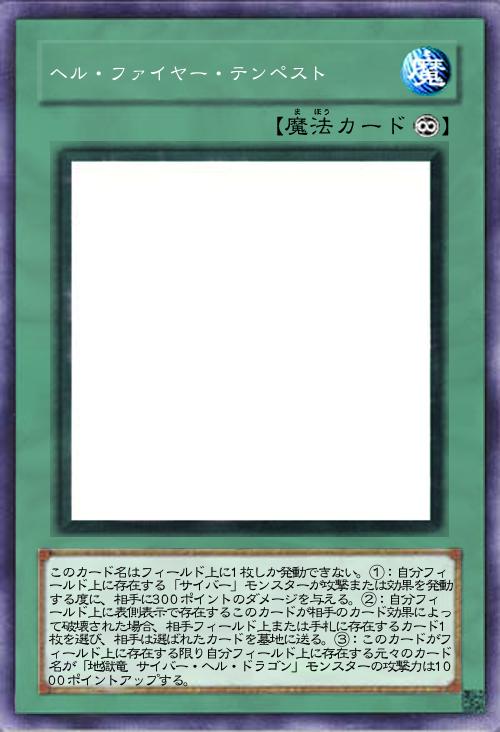 | このカード名はフィールド上に1枚しか発動できない。①:自分フィールド上に存在する「サイバー」モンスターが攻撃または効果を発動する度に、相手に300ポイントのダメージを与える。②:自分フィールド上に表側表示で存在するこのカードが相手のカード効果によって破壊された場合、相手フィールド上または手札に存在するカード1枚を選び、相手は選ばれたカードを墓地に送る。③:このカードがフィールド上に存在する限り自分フィールド上に存在する元々のカード名が「地獄竜 サイバー・ヘル・ドラゴン」モンスターの攻撃力は1000ポイントアップする。 | |||