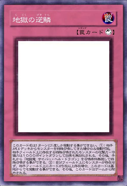 | このカード名は1ターンに1度しか発動する事ができない。①:相手がEXデッキからモンスターを特殊召喚してきた場合のみ発動可能。相手フィールド上に存在する特殊召喚されたモンスターの攻撃力・守備力は1000ポイントダウンして効果も無効化される。その後、手札から「地獄竜 サイバー・ヘル・ドラゴン」を召喚条件無視して特殊召喚する事ができる。②:自分フィールド上にモンスターが存在せず、相手フィールド上にカードが3枚以上存在場合、このカードは墓地からでも発動する事ができる。その後、このカードはゲームから除外される。 | |||