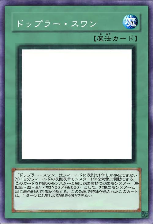 | 「ドップラー・スワン」はフィールドに表側で1体しか存在できない①:自分フィールドの表側表示モンスター1体を対象に発動できる。このカードを対象のモンスターと同じ効果を持つ効果モンスター(鳥獣族・風・星4・攻1700/守2000)として、対象のモンスターと同じ表示形式で特殊召喚する。この効果で特殊召喚されたこのカードは、1ターンに1度しか効果を発動できない | |||