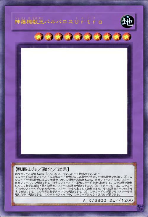 | 元々のレベルが8となる「バルバロス」モンスター+機械族モンスター このカードは自分フィールドの上記カードを素材とした融合召喚でしか特殊召喚できない。①:このカードが特殊召喚に成功した場合、元々の種族が鳥獣族となる、自分フィールドのモンスター1体をリリースして発動できる。相手のフィールド・墓地のカードを全て除外する。この効果の発動に対して相手は魔法・罠・効果モンスターの効果を発動できない。②:1ターンに1度、このカード以外のフィールドの表側表示モンスター1体を対象として発動できる。その効果をターン終了時まで無効にする。この効果は相手ターンでも発動できる。③:このカードの攻撃でモンスターを破壊した時に発動できる。このバトルフェイズ中、このカードはもう1度だけ攻撃できる。 | |||