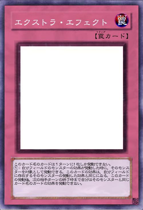 | このカード名のカードは1ターンに1枚しか発動できない。 ①:自分フィールドのモンスターの効果が発動した時に、そのモンスターを対象として発動できる。このカードの効果は、自分フィールドに存在するそのモンスターの発動した効果と同じになる。このカードの発動後、次の相手ターンの終了時まで自分はそのモンスターと同じカード名のカードの効果を発動できない。 | |||