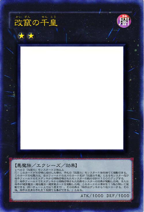| レベル2「改竄の」モンスター×2体以上 ①:このカードがX召喚に成功した場合、手札の「改竄の」モンスター1体を捨てて発動できる。このカードの攻撃力は、自分フィールドの元々のカード名が「改竄の千皇」となるモンスター及び相手フィールドのEXデッキから特殊召喚されたモンスターの数の合計×1000アップする。 ②:相手フィールドでEXデッキから特殊召喚された効果モンスターの効果が発動した時、または相手が通常魔法・速攻魔法・通常罠カードを発動した時、このカードのX素材を1つ取り除いて発動できる(同一チェーン上では1度まで)。その効果は「相手はデッキから1枚ドローする。その後、相手は自身の手札を1枚捨てる事ができる。」となる。 | |||