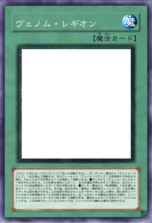 | このカード名のカードは1ターンに1枚しか発動できない。①:デッキ・墓地から「ヴェノム・スワンプ」1枚を選んで発動する。自分フィールドに「ヴェノム・スワンプ」が表側表示で存在する場合、代わりに以下の効果から1つを選択して発動できる。●デッキから「ヴェノム」モンスター1体を手札に加える。この効果を使用したターン、自分は通常召喚に加えて1度だけ、自分メインフェイズに爬虫類族モンスター1体を召喚できる。●デッキ・墓地から「蛇神降臨」1枚を選んで自分フィールドにセットする。その後、自分の手札・墓地の「毒蛇神ヴェノミナーガ」1枚を選んでデッキに戻す事ができる。この効果で手札のモンスターをデッキに戻した場合、更に相手フィールドの全ての表側表示カードの効果を無効化する。②:このカードが墓地に存在する場合、フィールドのヴェノムカウンターを3つ取り除いて発動できる。墓地のこのカードを自分フィールドにセットする。この効果でセットしたこのカードは、フィールドから離れた場合に除外される。 | |||