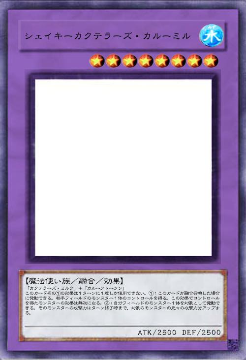 | 「カクテラーズ・ミルク」+「カルーアトークン」 このカード名の①の効果は1ターンに1度しか使用できない。①:このカードが融合召喚した場合に発動できる。相手フィールドのモンスター1体のコントロールを得る。この効果でコントロールを得たモンスターの効果は無効になる。②:自分フィールドのモンスター1体を対象として発動できる。そのモンスターの攻撃力はターン終了時まで、対象のモンスターの元々の攻撃力分アップする。 | |||