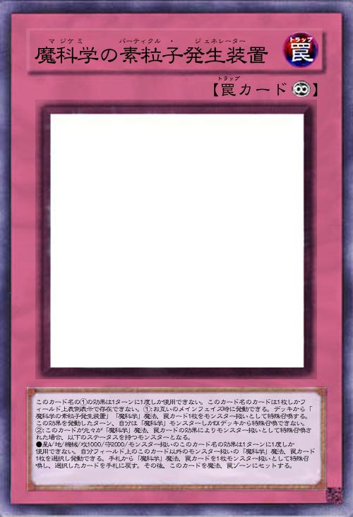 | このカード名の①の効果は1ターンに1度しか使用できない。このカード名のカードは1枚しかフィールド上表側表示で存在できない。①:お互いのメインフェイズ時に発動できる。デッキから「魔科学の素粒子発生装置」「魔科学」魔法、罠カード1枚をモンスター扱いとして特殊召喚する。この効果を発動したターン、自分は「魔科学」モンスターしかEXデッキから特殊召喚できない。②:このカードが元々が「魔科学」魔法、罠カードの効果によりモンスター扱いとして特殊召喚された場合、以下のステータスを持つモンスターとなる。 ●星4/地/機械/攻1000/守2000/モンスター扱いのこのカード名の効果は1ターンに1度しか使用できない。自分フィールド上のこのカード以外のモンスター扱いの「魔科学」魔法、罠カード1枚を選択し発動できる。手札から「魔科学」魔法、罠カードを1枚モンスター扱いとして特殊召喚し、選択したカードを手札に戻す。その後、このカードを魔法、罠ゾーンにセットする。 | |||