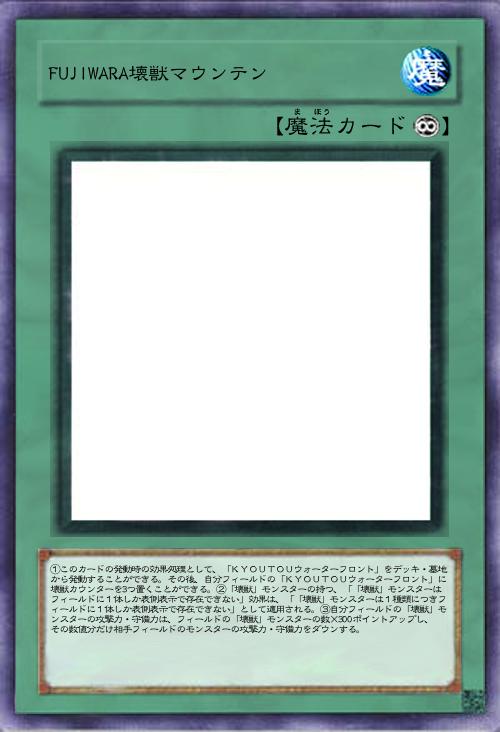 | ①このカードの発動時の効果処理として、「KYOUTOUウォーターフロント」をデッキ・墓地から発動することができる。その後、自分フィールドの「KYOUTOUウォーターフロント」に壊獣カウンターを3つ置くことができる。②「壊獣」モンスターの持つ、「「壊獣」モンスターはフィールドに1体しか表側表示で存在できない」効果は、「「壊獣」モンスターは1種類につきフィールドに1体しか表側表示で存在できない」として適用される。③自分フィールドの「壊獣」モンスターの攻撃力・守備力は、フィールドの「壊獣」モンスターの数×300ポイントアップし、その数値分だけ相手フィールドのモンスターの攻撃力・守備力をダウンする。 | |||
