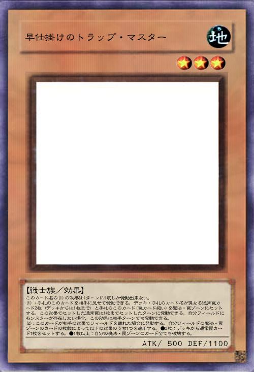 | このカード名の(1)の効果は1ターンに1度しか発動出来ない。 (1):手札のこのカードを相手に見せて発動できる。デッキ・手札のカード名が異なる通常罠カード2枚(デッキからは1枚まで)と手札のこのカード(罠カード扱い)を魔法・罠ゾーンにセットする。この効果でセットした通常罠は1枚までセットしたターンに発動できる。自分フィールドにモンスターが存在しない場合、この効果は相手ターンでも発動できる。 (2):このカードが相手の効果でフィールドを離れた場合に発動する。自分フィールドの魔法・罠ゾーンのカードの枚数によって以下の効果のうち1つを適用する。●0枚:デッキから通常罠カード1枚をセットする。●1枚以上:自分の魔法・罠ゾーンのカード全てを破壊する。 | |||