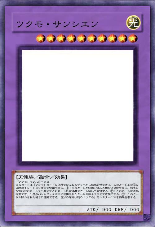 | 「ツクモ」モンスター×3 このカードは「ツクモ」カードの効果でのみEXデッキから特殊召喚できる。このカード名の③の効果は1ターンに2度まで使用できる。①:このカードが特殊召喚した場合に発動できる。相手の除外状態のカードを3枚までこのカードに装備魔法カード扱いで装備する。②:このカードは直接攻撃でき、1度のバトルフェイズ中に装備されたカードの数+1回まで攻撃できる。③:このカードが除外された場合に発動できる。自分の除外状態の「ツクモ」モンスター1体を特殊召喚する。 | |||
