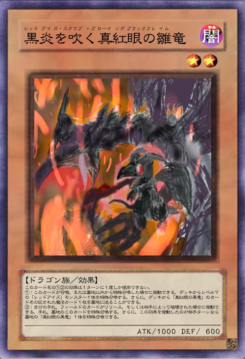 | このカード名の①②の効果は1ターンに1度しか使用できない。 ①:このカードが召喚、または墓地以外から特殊召喚した場合に発動できる。デッキからレベル7の「レッドアイズ」モンスター1体を特殊召喚する。さらに、デッキから「真紅眼の黒竜」のカード名の記された魔法カード1枚を墓地に送ることができる。 ②:自分の手札、フィールドのカードがリリース、もしくは相手によって破壊された場合に発動できる。手札、墓地のこのカードを特殊召喚する。さらに、この効果を発動したのが相手ターンなら墓地の「真紅眼の黒竜」1体を特殊召喚できる。 | |||