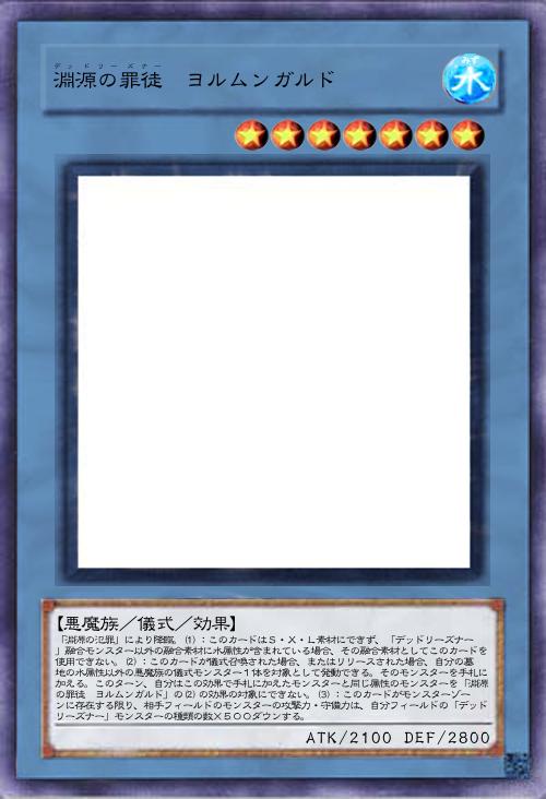 | 「淵源の氾罪」により降臨。(1):このカードはS・X・L素材にできず、「デッドリーズナー」融合モンスター以外の融合素材に水属性が含まれている場合、その融合素材としてこのカードを使用できない。(2):このカードが儀式召喚された場合、またはリリースされた場合、自分の墓地の水属性以外の悪魔族の儀式モンスター1体を対象として発動できる。そのモンスターを手札に加える。このターン、自分はこの効果で手札に加えたモンスターと同じ属性のモンスターを「淵源の罪徒 ヨルムンガルド」の(2)の効果の対象にできない。(3):このカードがモンスターゾーンに存在する限り、相手フィールドのモンスターの攻撃力・守備力は、自分フィールドの「デッドリーズナー」モンスターの種類の数×500ダウンする。 | |||
