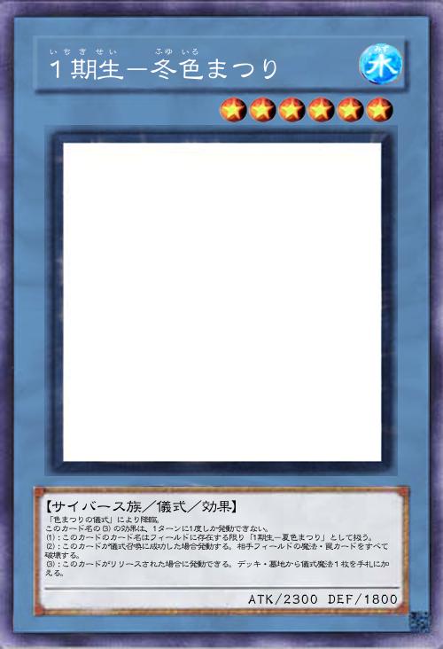 | 「色まつりの儀式」により降臨。 このカード名の(3)の効果は、1ターンに1度しか発動できない。 (1):このカードのカード名はフィールドに存在する限り「1期生-夏色まつり」として扱う。 (2):このカードが儀式召喚に成功した場合発動する。相手フィールドの魔法・罠カードをすべて破壊する。 (3):このカードがリリースされた場合に発動できる。デッキ・墓地から儀式魔法1枚を手札に加える。 | |||