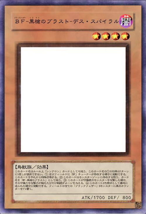 | このカード名はルール上「シンクロン」カードとしても扱う。このカード名の①の効果は1ターンに1度しか使用できない。①:自分フィールドに「BF」チューナーが存在する場合に発動できる。このカードを手札から特殊召喚する。②:このカードはモンスターゾーンに存在する限り、カード名を「BF-黒槍のブラスト」として扱う。③:このカードが守備表示モンスターを攻撃した場合、その守備力を攻撃力が超えた分だけ戦闘ダメージを与える。④:このカードがS素材として墓地に送られた場合に発動できる。フィールドの全ての「ブラックフェザー」Sモンスターに黒羽カウンターを1つ置く。 | |||