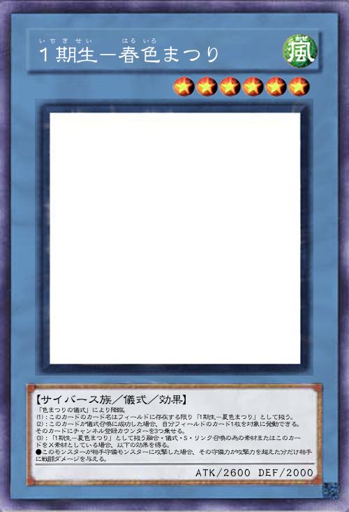 | 「色まつりの儀式」により降臨。 (1):このカードのカード名はフィールドに存在する限り「1期生-夏色まつり」として扱う。 (2):このカードが儀式召喚に成功した場合、自分フィールドのカード1枚を対象に発動できる。そのカードにチャンネル登録カウンターを3つ乗せる。 (3):「1期生-夏色まつり」として扱う融合・儀式・S・リンク召喚の為の素材またはこのカードをX素材としている場合、以下の効果を得る。 ●このモンスターが相手守備モンスターに攻撃した場合、その守備力が攻撃力を超えた分だけ相手に戦闘ダメージを与える。 | |||
