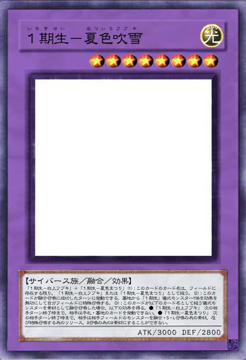 | 「1期生-白上フブキ」+「1期生-夏色まつり」(1):このカードのカード名は、フィールドに存在する限り、「1期生-白上フブキ」または「1期生-夏色まつり」として扱う。(2):このカードが融合召喚に成功したターンに発動できる。墓地から「1期生」儀式モンスター1体を効果を無効にして自分フィールドに特殊召喚する。(3):このカードが以下のカード名として扱う儀式モンスターを素材として融合召喚した場合、以下の効果を得る。●「1期生-白上フブキ」∶次の相手ターン終了時まで、相手は手札・墓地のカードを発動できない。●「1期生-夏色まつり」∶次の相手ターン終了時まで、相手は相手フィールドのモンスターを融合・S・L召喚の為の素材、及び特殊召喚する為のリリース、X召喚の為のX素材にすることができない。 | |||